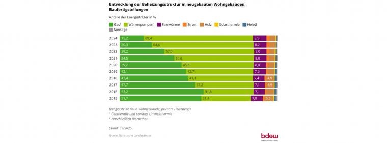 Nach den Ergebnissen des Barometers gewinnen Wärmepumpen bei neuen Ein- und Zweifamilienhäusern deutlich an Bedeutung. Diese werden mittlerweile zu drei Vierteln mit Wärmepumpen beheizt. Auch die Fernwärme etabliert sich laut dem BDEW zunehmend – sie ist heute bei neu gebauten Wohnungen die zweithäufigste Beheizungsart. Der Trend vom Energieträger Erdgas hin zur Wärmepumpe nimmt demnach in Wohngebäuden seit 2018 erkennbar zu. Zusammengenommen machen Wärmepumpen und Fernwärme gut 70 Prozent der gewählten Heizsysteme in neuen Wohnungen insgesamt aus. Der Anteil fossiler Energieträger wie Gas sinkt hingegen.