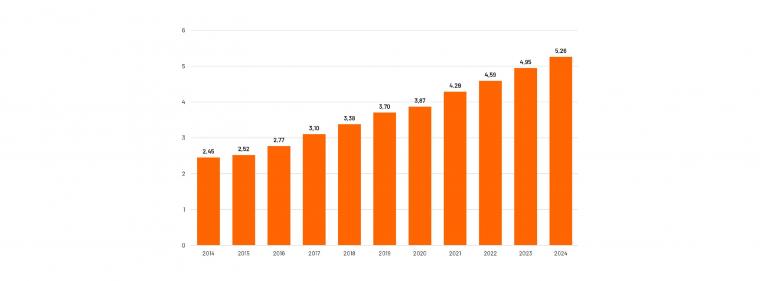 Entwicklung der Umsätze von 2014 bis 2024 (in Mrd. Euro)