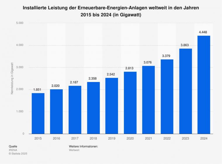 Die Statistik zeigt die Entwicklung der installierten Leistung von Erneuerbare-Energien-Anlagen weltweit in den Jahren 2015 bis 2024. Die Daten stammen von der Internationalen Agentur für Erneuerbare Energien (Irena). Im Jahr 2024 verfügten die alternativen Energieanlagen weltweit über eine Gesamtleistung von rund 4.448 GW.