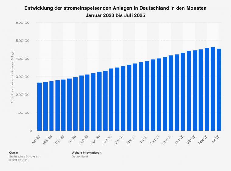 Im Juli 2025 lag die Anzahl der stromeinspeisenden Anlagen in Deutschland bei insgesamt rund 4,6 Millionen Anlagen. Seit Anfang des Jahres ist die Zahl der dieser Anlagen kontinuierlich gewachsen. Der Großteil entfiel dabei auf Anlagen mit dem Energieträger Photovoltaik. Die Daten der Grafik stützen sich auf Daten des Statistischen Bundesamtes.