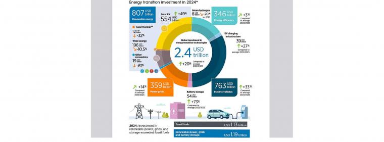 Im Jahr 2024 erreichten die weltweiten Investitionen in Energiewendetechnologien ein Rekordhoch von 2,4 Billionen US-Dollar (umgerechnet etwa 2,1 Billionen Euro). Dies war laut dem Bericht ein Anstieg von 20 Prozent im Vergleich zum durchschnittlichen Jahresniveau von 2022/2023. Das Wachstum in relativ ausgereifte Technologien, wie erneuerbare Energien, Energieeffizienz, Netze und elektrifizierter Verkehr setzte sich im Jahr 2024 fort, wenn auch in einem langsameren Tempo als in den Vorjahren.