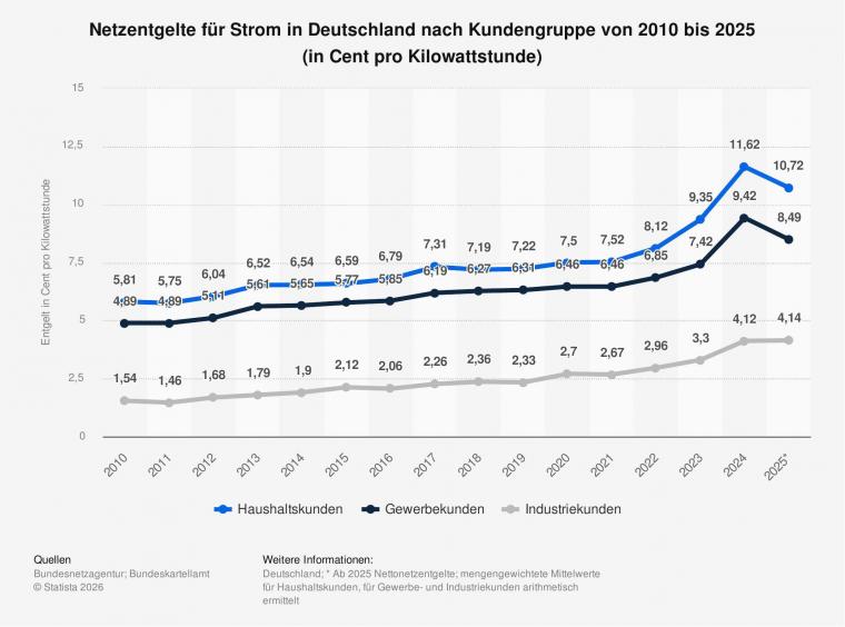 Zum 1. April 2025 zahlten Haushaltskunden für die Grundversorgung mit Strom im Durchschnitt 10,72 Cent pro kWh netto Netzentgelt. Erhebungszeitraum waren der 1. April 2010 bis zum 1. April 2025. Seit 2025 wurden die Nettonetzentgelte als mengengewichtete Mittelwerte für Haushalts-, Gewerbe- und Industriekunden arithmetisch ermittelt.