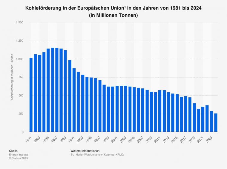 Die Statistik zeigt die Kohleförderung in der Europäischen Union in den Jahren von 1981 bis 2024 in Millionen Tonnen. Berücksichtigt wurden ausschließlich handelsübliche feste Brennstoffe, zum Beispiel bitumenhaltige Steinkohle und Anthrazit (Hartkohle), Hart- und Weichbraunkohle. Im Jahr 2024 belief sich die Kohleförderung in der Europäischen Union auf rund 255,7 Millionen Tonnen.