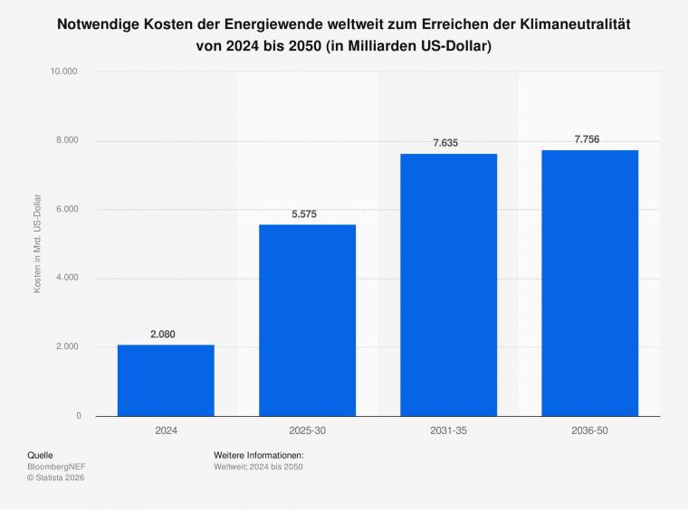 Die Grafik zeigt, die notwendige jährlichen Kosten der Energiewende weltweit zum Erreichen der Klimaneutralität von 2024 bis 2050 in Milliarden US-Dollar. Global erreichten die Investitionen in die Energiewende 2024 mit rund 2,1 Billionen US-Dollar einen neuen Rekordwert. Um das Netto-Null-Ziel bis 2050 zu erreichen, müssten die jährlichen Investitionen in den kommenden Jahren jedoch verdreifacht werden.