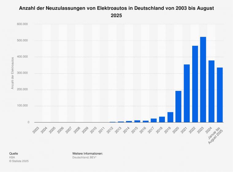 Zwischen Januar und August 2025 wurden in Deutschland rund 336.700 Elektroautos neu zugelassen. Im Vergleich zum Vorjahreszeitraum war dies ein Anstieg um gut 39 Prozent. Das Jahr 2024 sah in Deutschland etwa 380.600 Neuzulassungen von E-Autos. Damit lag die Zahl im Vergleich zum Jahr 2023 fast 27,4 Prozent niedriger. Der Anteil der E-Autos an den gesamten Pkw-Neuzulassungen lag im Jahr 2024 bei 13,5 Prozent. Diese Zahlen basieren auf Angaben des Kraftfahrtbundesamtes (KBA).