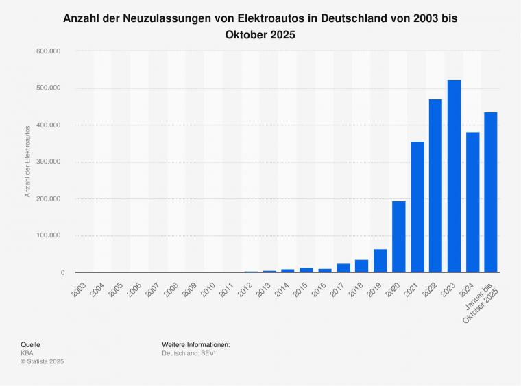 Zwischen Januar und Oktober 2025 wurden in Deutschland rund 434.600 Elektroautos neu zugelassen. Damit wurden bis zu diesem Zeitpunkt bereits mehr vollelektrische Fahrzeuge neu angemeldet als im gesamten Vorjahr. Im Vergleich zum Vorjahreszeitraum (Januar bis Oktober 2024) war dies ein Anstieg um etwa 39 Prozentpunkte. Das Jahr 2024 sah in Deutschland etwa 380.600 Neuzulassungen von E-Autos. Damit lag die Zahl im Vergleich zum Jahr 2023 fast 27,4 Prozent niedriger. Der Anteil der E-Autos an den gesamten Pkw-Neuzulassungen lag im Jahr 2024 bei 13,5 Prozent. Die Daten beruhen auf einer Erhebung des Kraftfahrtbundesamtes.