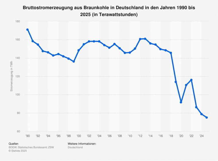 Die Statistik zeigt die Entwicklung der Bruttostromerzeugung aus Braunkohle in Deutschland in den Jahren 1990 bis 2025. Im Jahr 2025 wurden in Deutschland rund 75 Milliarden kWh Strom aus dem fossilen Energieträger Braunkohle erzeugt.